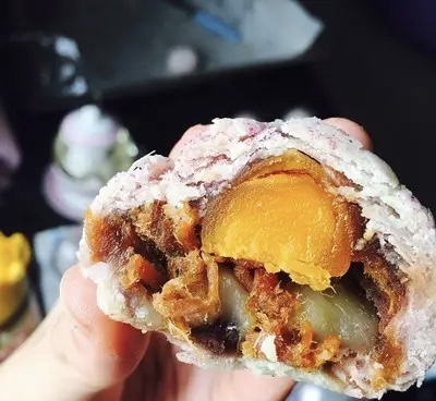 5.包好的面團(tuán)用搟面杖搟成長(zhǎng)條,從上往下卷起,再次搟成長(zhǎng)條。兩次后搓成團(tuán)備用。6.搟好的面團(tuán)壓成面餅,依次放上準(zhǔn)備好的昊東肉松、豆沙、麻薯、蛋黃包成球球,收口朝下。